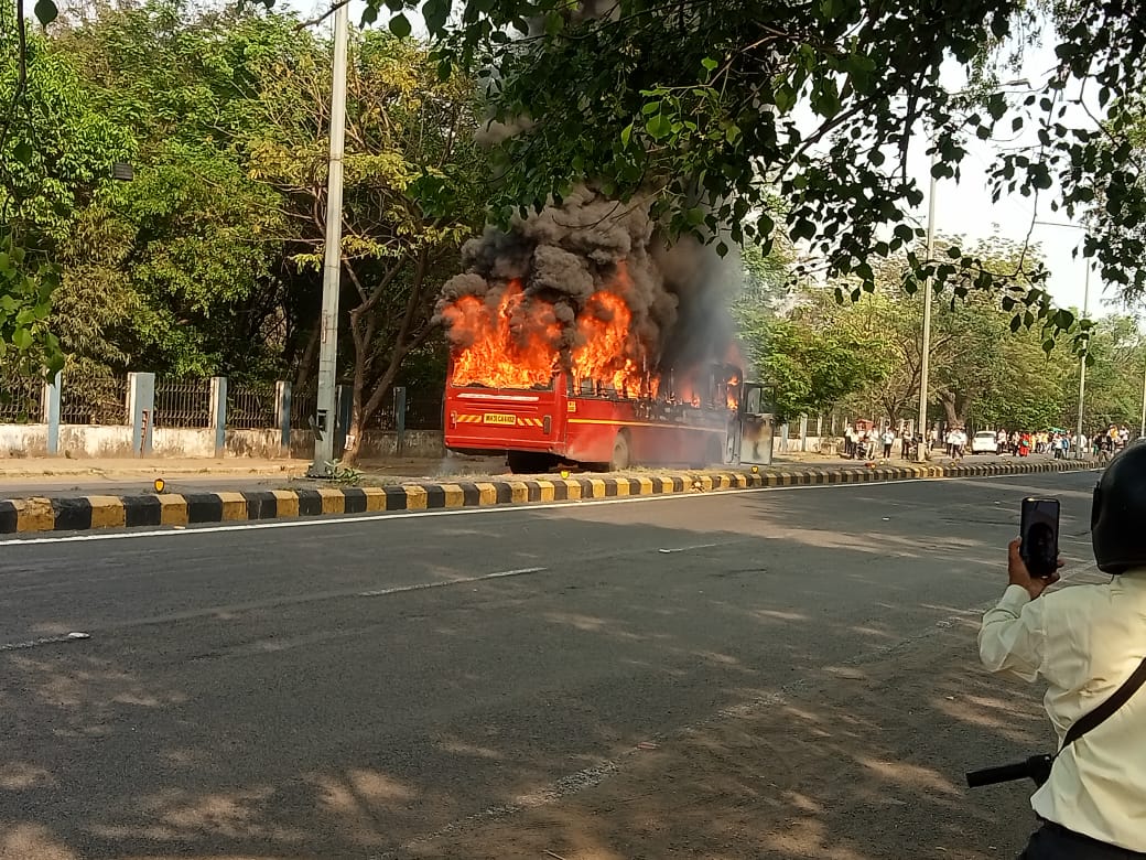 गिट्टीखदान काटोल रोड पर गिट्टीखदान पुलिस स्टेशन के आगे चलती स्टार बस में अचानक आग लग गई और ये धू धू कर जलने लगी
