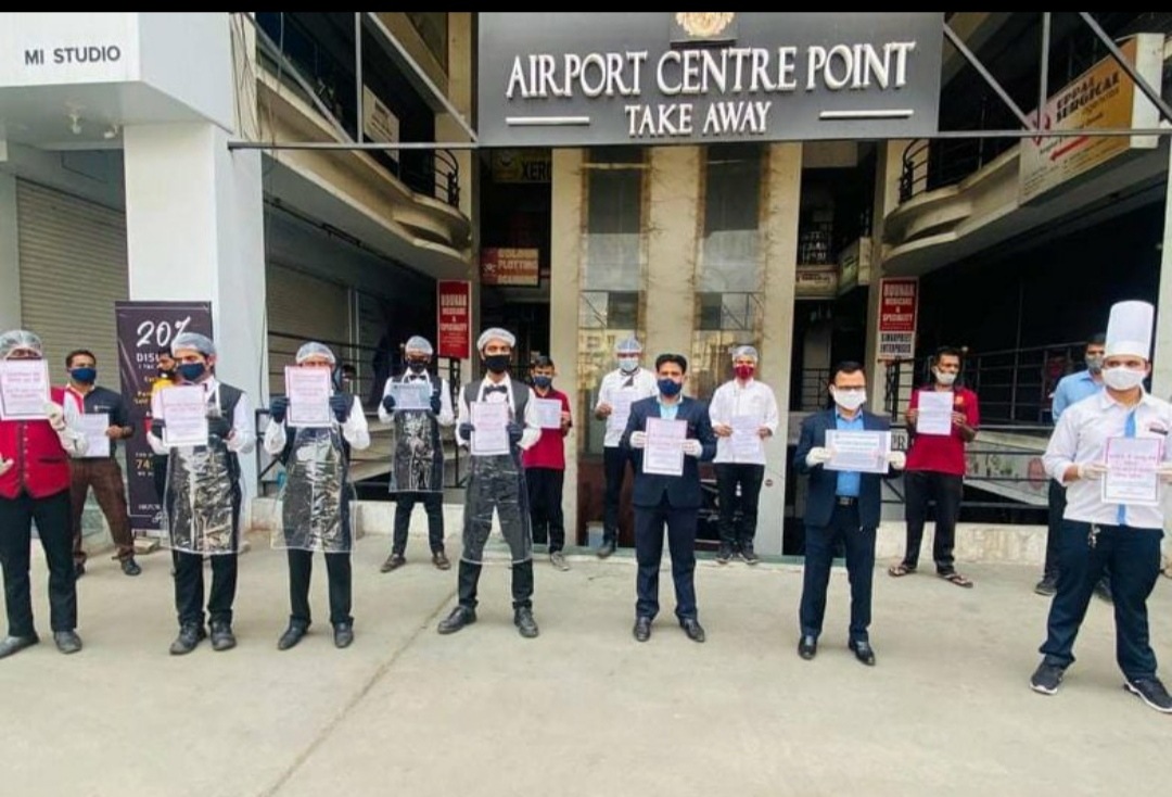नागपूर में होटल एसोसिएशन मेंबर्स ने अपने अपने होटल के बाहर बैनर लेकर कर्मचारियों के साथ मूक विरोध प्रदर्शन किया