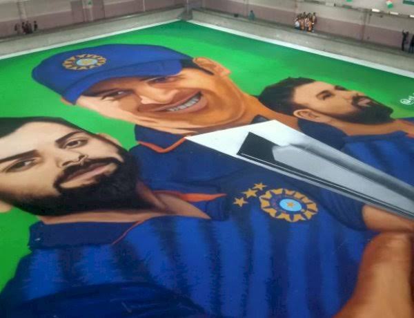 इसमें भारतीय टीम के कप्तान विराट कोहली, महेंद्र सिंह धोनी और रोहित शर्मा की खूबसूरत आकृति उकेरी गई है। इसे बनाने में करीब 3000 किलो रंग का इस्तेमाल किया गया है।